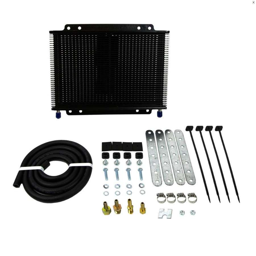 B&M Super Coolers are 100 Percent aluminum construction and use stamped plates sandwiched together to create one of the most efficient oil cooling devices available. Not only does this unique design provide for maximized cooling through more efficient heat dissipation but it also provides a much sturdier cooler which is practically impervious to flying rocks or other debris. The Super-Coolers intended for automatic transmission fluid also offer an additional feature known as “low pressure drop”. The coolers assembled with hose barb ends include a unique bypass feature allowing a controlled amount of ATF to bypass the stacked plate core when the fluid is cold. This is beneficial in cold climate areas to guard against lube system failure. Controlled by viscosity, fluid is returned directly to the lube circuit through bypass openings in the stacked plate core. As the temperature increases, more ATF is directed through the core. This highly efficient design combines improved protection against lube system failure with the required levels of optimal heat transfer.