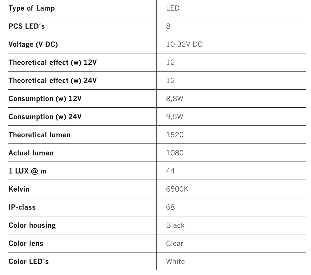 Hágæða inniljós 281mm langt sem veitir ótrúlega góða birtu. Hentar vel inn í sendibíla, pallhús eða einfaldlega bara inn í bílinn þinn. Litahitastig ljóssins er 5000K sem gefur þér þægilegasta ljósið til að vinna í og veitir þér besta vinnuskilyrðið til að vinna vinnuna þína. Þolir -35°C til +45°C, og er vatnshelt samkvæmt IP67 staðlinum. Ljósið kemur í álhúsi og linsan er úr gagnsæjum PC (polycarbonate), mjög endingargóðu efni. Auðvelt er að festa ljósið með meðfylgjandi 2,5 m snúru og klemmum eða skrúfum. Þriggja ára ábyrgð frá Strands er á ljósinu.
